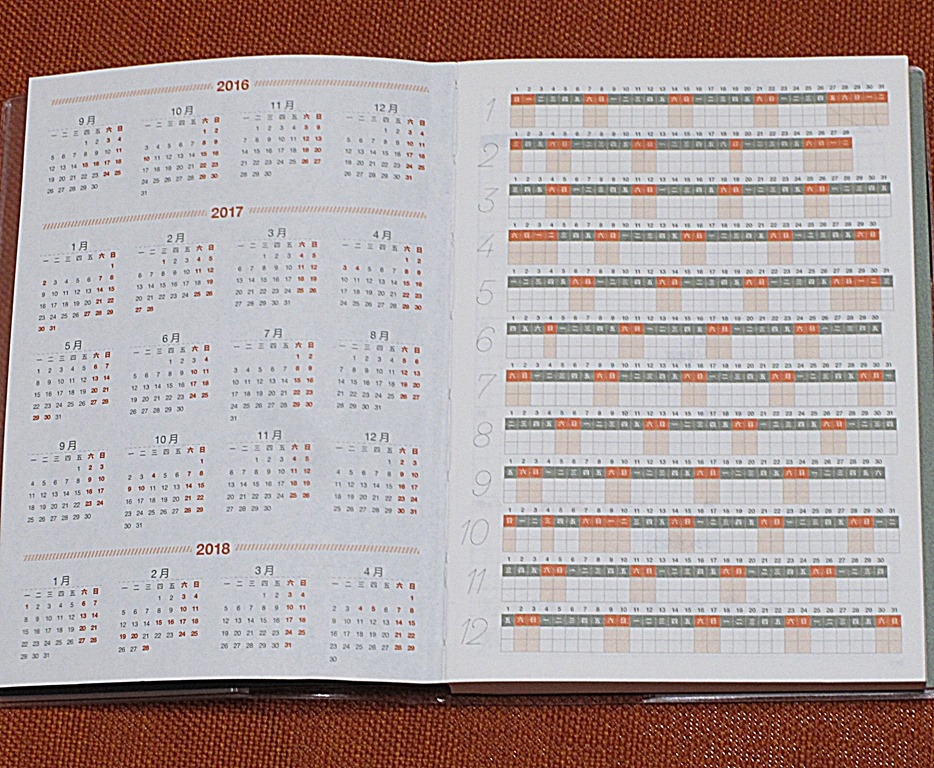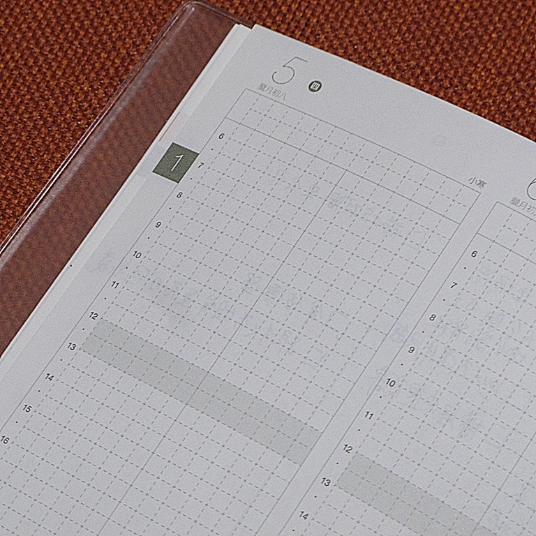 側邊的月份用顏色做區分,這次採用兩色,單月是沉穩的麴塵色,而雙月是明亮的黃丹色,這也是內頁中區分假日跟非假日的顏色區別。